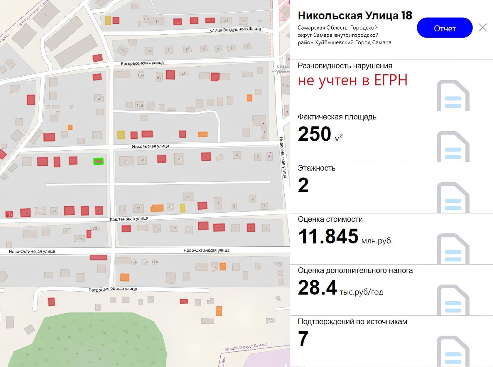 На портале (https://rk.geosamara.ru/product/izhsnotcadaster) доступная статистика по количеству нарушений различного типа и оценке налоговых резервов в разрезе регионов, муниципалитетов, а также образец реальных данных по Самарской области. Для получения примера данных по своему городу можно обратиться к специалистам компании.